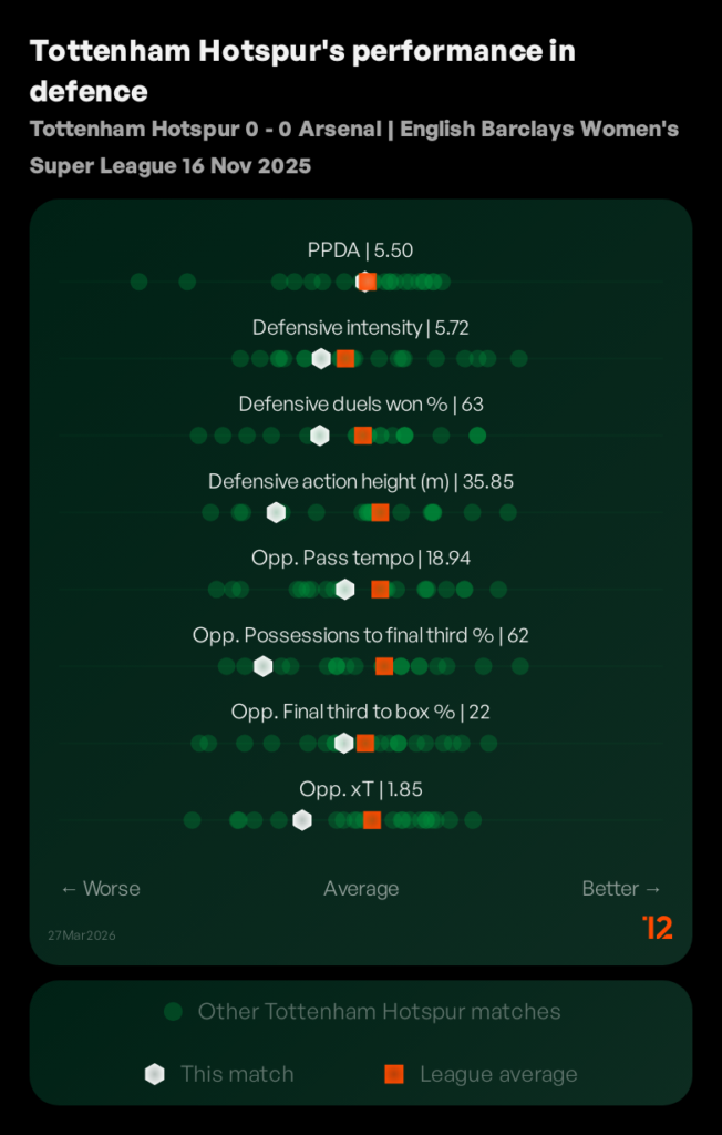 In their last encounter, Spurs gave up control of midfield in order to stop Arsenal scoring. The graph below shows they dropped back and played with lower intensity. It was not pretty, but it worked.